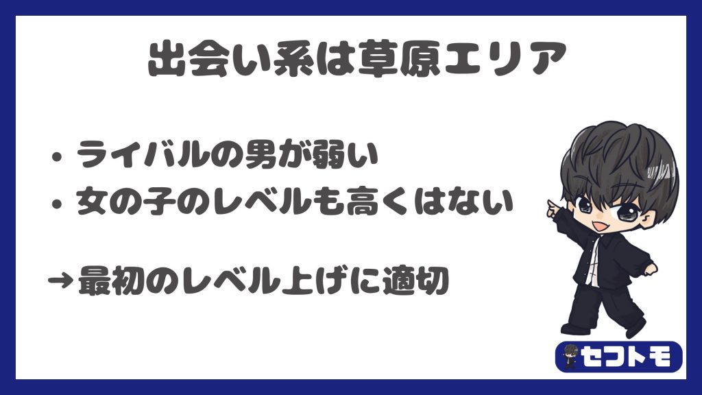 このどちらでも、最初は出会い系サイトという草原エリアから始めるのが一番スムーズでおすすめだよ!