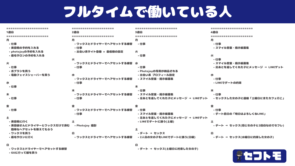 - 忙しい社会人なら4週間、時間に余裕がある人なら3週間くらいでセフレは作れる