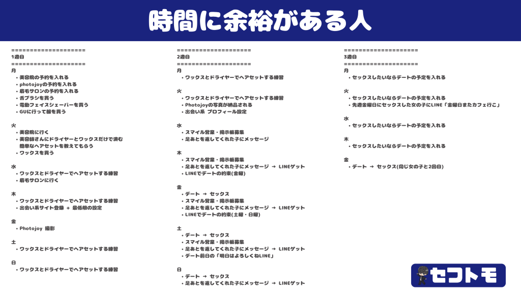 実際に自分に合わせたスケジュールを立ててセフレを作るために行動をしてみてください