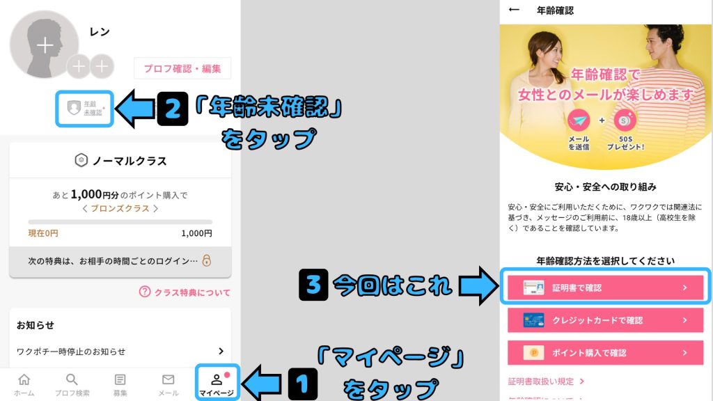画面下にある「マイページ」をタップし、画面上にある「年齢未確認」と書かれた場所をタップします