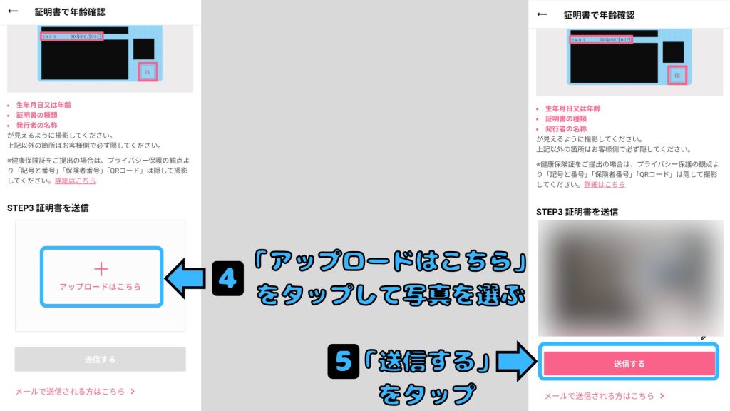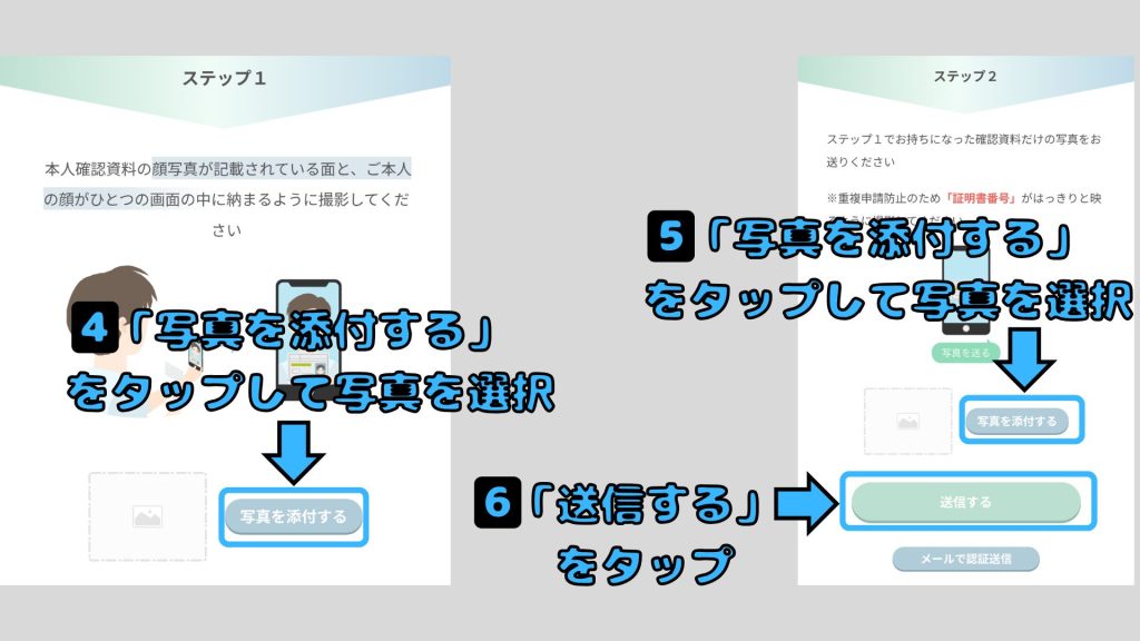 顔写真付きの本人確認書類(免許証、マイナンバーなど)を持って自撮りした写真を送ります