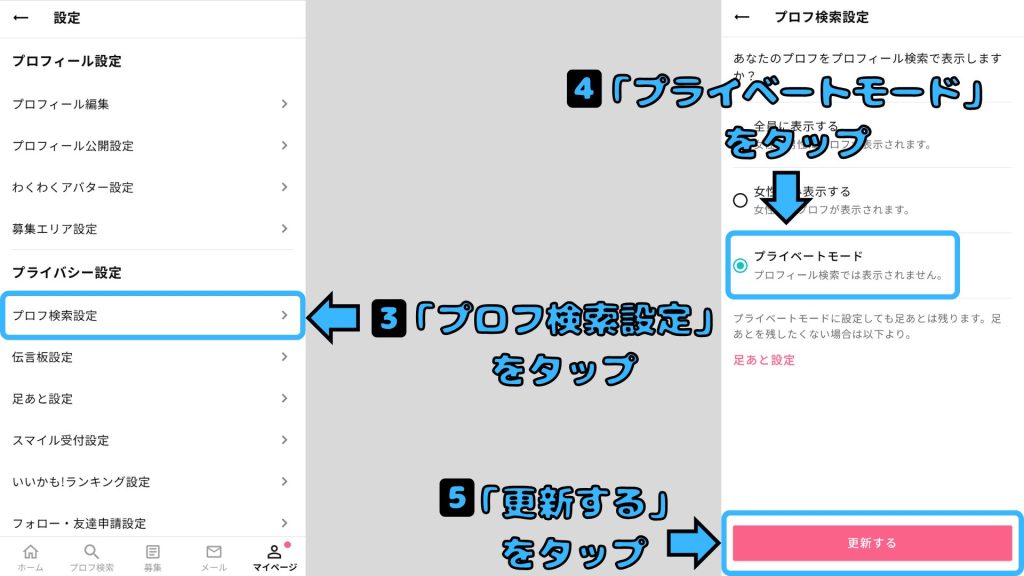「プロフ検索設定」をタップし、「プライベートモード」をタップします