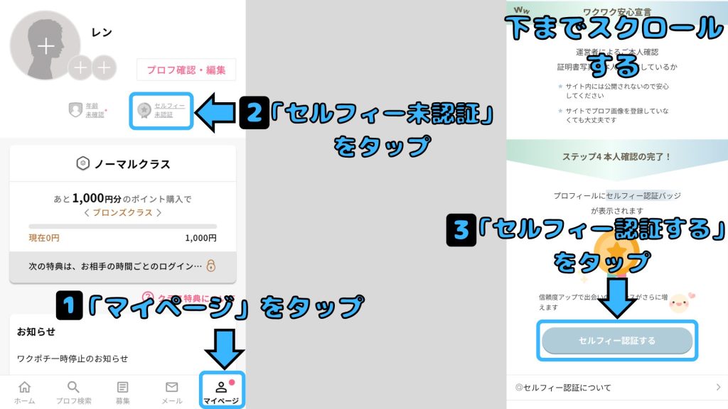 画面下にある「マイページ」をタップし、「セルフィー未認証」をタップします
