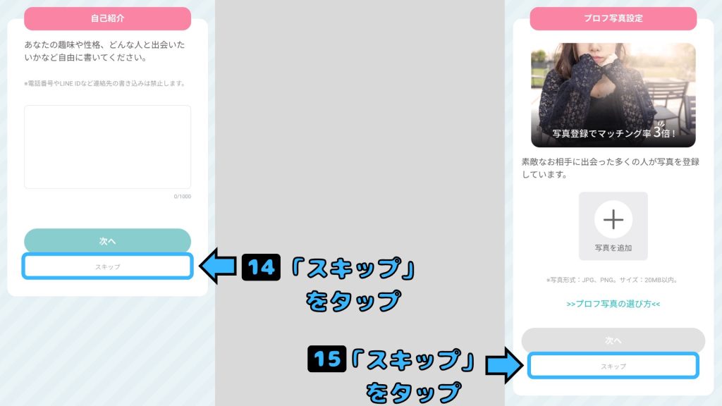プロフィールの設定は後でより細かく設定できるので、今は「スキップ」をタップしてください