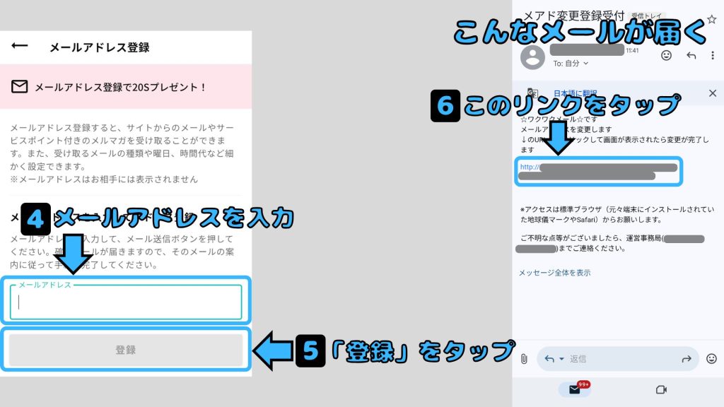 ワクワクメールからメールが届くので、メールの中に記載されているリンクをタップします